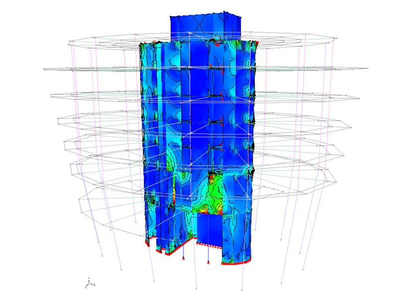 Fixed support points were defined at the locations where this tower building is supported by the plinth: 16 fixed support points at the bottom of the columns and fixed support lines along the bottom side of the central core’s walls. The reaction forces at those support points were the first results we eagerly investigated for each variant of this analysis model. Conversely, those reaction forces were then entered as loads in the structural analytical model of the plinth to transfer the impact of the tower building’s permanent and service loads to the foundation level.