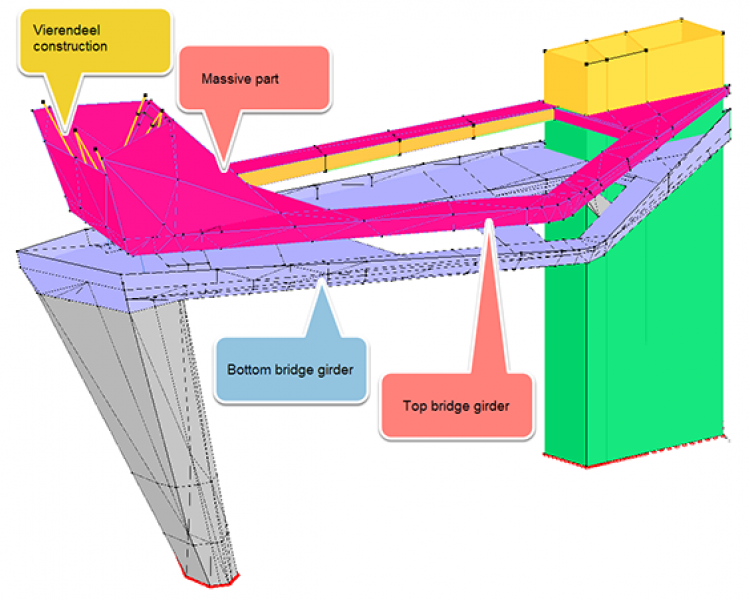 In een eerste stap werd het Diamonds rekenmodel gebruikt om de maximale reactiekrachten in de ondersteuningsconstructie te berekenen tijdens het storten van de onderligger. Voor die vrij klassieke berekening van reactiekrachten werd gewerkt op basis van een lage E-modulus voor het beton van de brugligger. Een heel pak uitdagender is de berekening van wat gebeurt bij het ontgrendelen van de kantelpennen, 28 dagen na het storten van de onderligger en vlak voor uitvoering van de bovenligger.