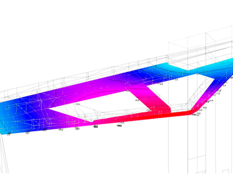 Er werd een 3D-model voor structurele analyse van de brugconstructie gebouwd met behulp van Diamonds om de haalbaarheid van de geselecteerde aanpak te valideren en te verifiëren. De onderligger werd gedefinieerd als ondersteund door een elastische fundering, om rekening te houden met de vrijwel uniforme ondersteuning door een groot aantal POLY-elementen tijdens de bouwfase. De eigenschappen van deze elastische fundering zijn afgeleid van de samendrukbaarheid van de POLY-elementen en de eigenschappen van de ondergrond.